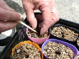 土を混ぜて、ポットに入れ、割り箸で穴を開ける。
