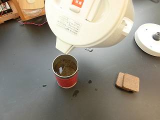 土はお湯を入れると一気に元に戻る。実は土を入れた状態でお湯を注がなければいけなかった。