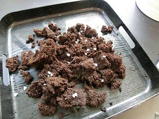 いったんトレイにあけて、根腐れ防止の石(ゼオライトかな)を混ぜて冷やす。