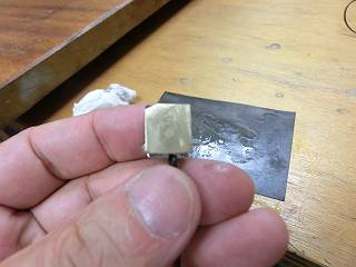 真鍮板が平滑でないからかもしれないと、400番のやすりで水研ぎする。