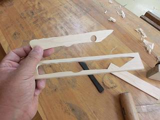 半分にした片側に切り出しの方を写して糸のこ盤でくりぬく。