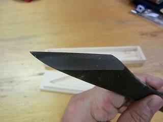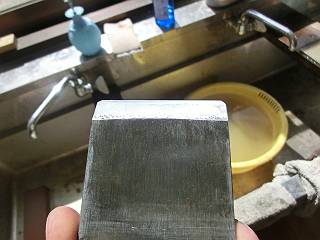 見えてきた感触というのは、「押すときに砥石に吸い付けるような感じで前に出す」というもの。切り出しもかんな刃も、(それほど)丸っ刃にならずに刃がえりが出た。それでもこうやって写真で見るとラインがでていないから御粗末だなぁ。そんなに簡単にいくわけもなく、ここにいる間に経験を積みたいと思う。