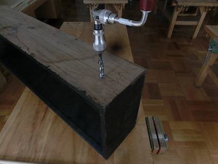 目分量でけびきをせっとして、角から同じ長さにけがいて15mmのショートビットをクリックボールにつけて穴を開ける。