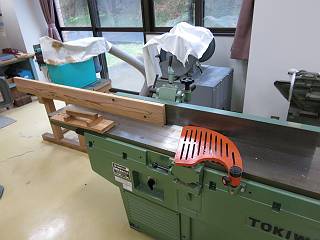 基準面を出すために手押しかんな盤を使う。危険な機械でもあるので大事に扱いたい。材を押すジグも講座で製作する。