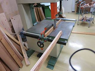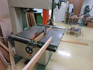 パズルにするには、材が厚いので帯鋸で半分に割る。この帯鋸は現場にはなかなか置いていないなぁ。