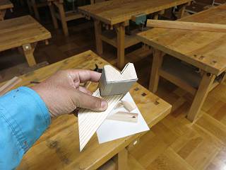 実際に自分が生徒にさせるなら、理論の学習をしてから横びき(横断)を何度か練習させて、うまくなったらパズルへ進む(測って45°の切断へ)という流れかな。最初の横引きは長い材の間ならうまく切れると切断面を下にしてまっすぐ立つというのがわかりやすいかも。もちろん測定具(さしがねやスコヤ)の使い方も並行して教えるのですが。