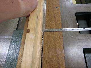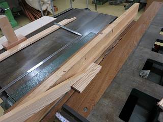 両側に溝を入れたら、縦びきして高さをそろえる。一枚の両こばから20mmで切断した。