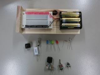 これが、実験セット。手元に一つ置いておけば授業以外にちょっとした回路を試すのにもいいかと思う。