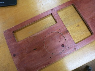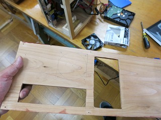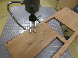 背板は木ネジだけで留めていたので外してけがきをした後,糸鋸でくりぬく。