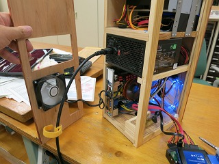 組み立てる前に一度接続したまま通電して風の方向を確認。このファンは外へ空気を吐き出す向きにした。
