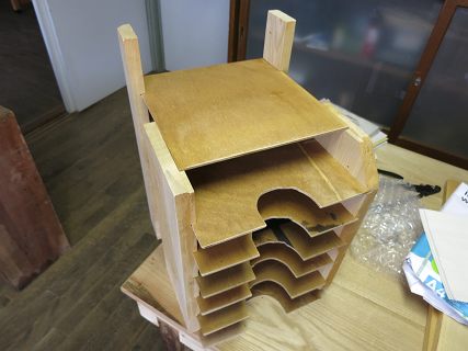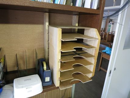 古い教材を分解した板が保管してあったので,プリント整理用の棚を作る。