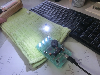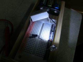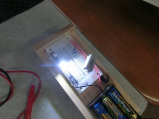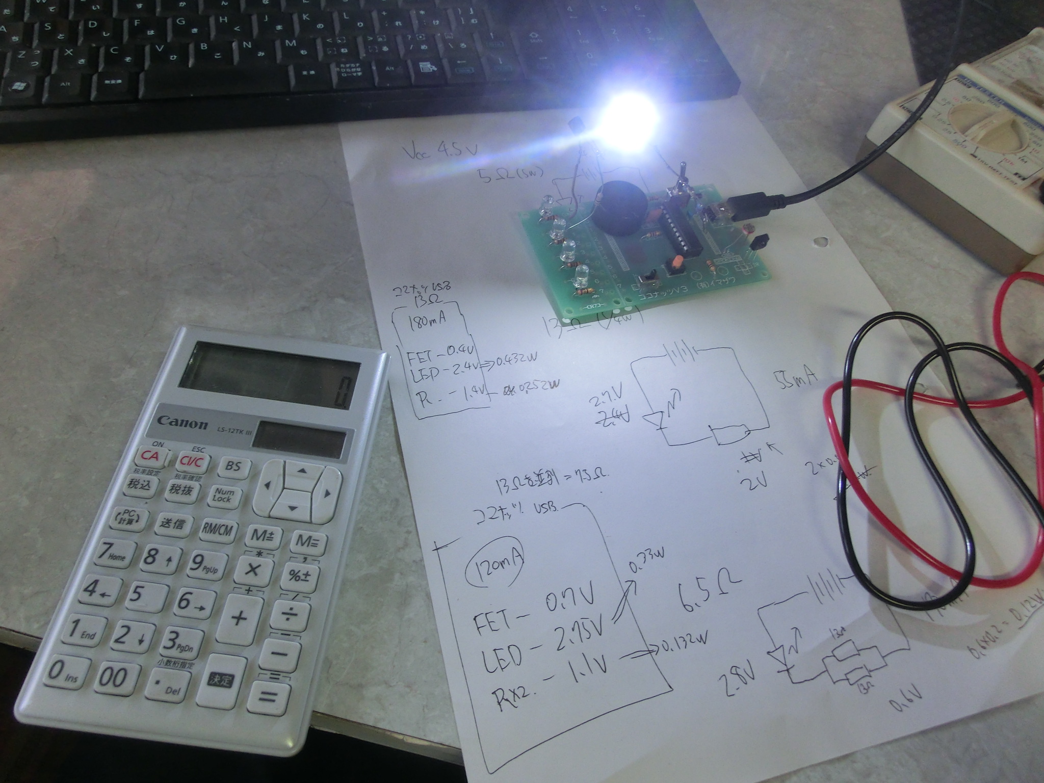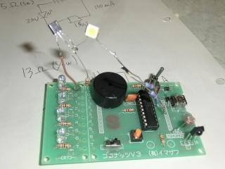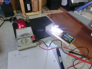 走り書きの左上の状態でこの点灯。抵抗が1/4wでぎりぎりだけれど、まあこれ以上の電力消費はないだろうから大丈夫でしょう。