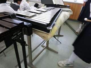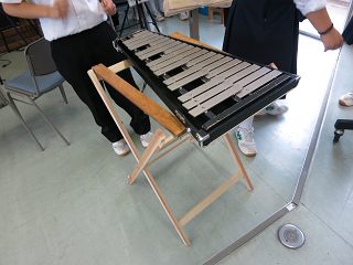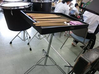 もう一つはグロッケン、いわゆる鉄琴。現在は生徒用の机に毛布を置いて高さあわせをした上で使っている。
