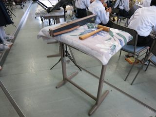 まずは、スティックなどを置くテーブル。演奏中も打楽器は忙しそうに行ったり来たりしているので、わりかし大事なテーブル。