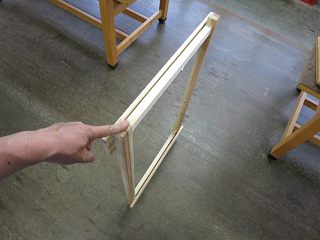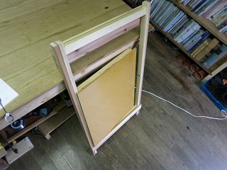ほぞ組で枠を一つ作って、外側は板を取り付けてX型のスタンドにしてみた。