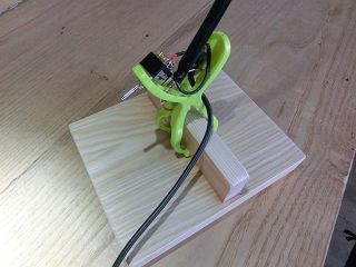 USB電源につなぐとこんな感じ。台座は木で作ってみた。