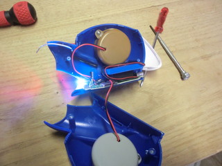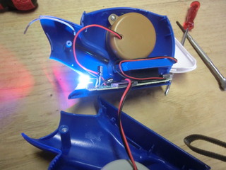 コンデンサーを取り外してみたけど明るさはかわらず、LEDに制限抵抗をつけて暗くすることにした。