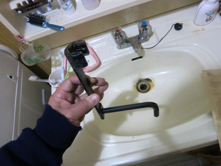 ユニットバスなので、点検口から総ての作業を行うしかなかった。フレキ管を取り外した後、縦カラン閉めでカラン本体を緩めて取り外す。