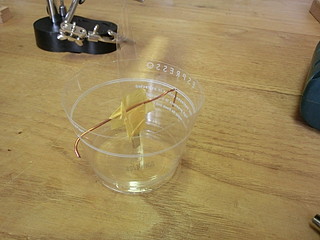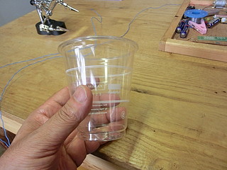 まずは、プラスチックコップに検針をつけてコイルを巻いてみることにする。