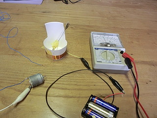 今度は直列につないでモーターを回すとメーターが振れる。ちなみに指針はお弁当の蓋を切って作った。