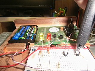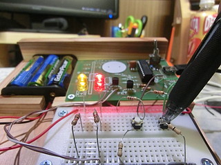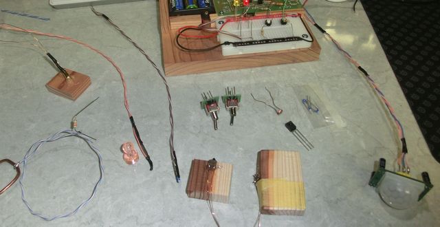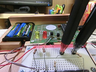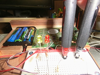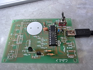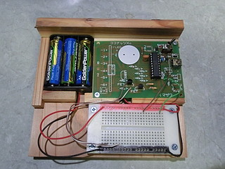 ココナッツの基板を使えば、かなり簡単にできると考えて作ったのが上の回路、センサーと出力はブレッドボードに接続して実験することにした。