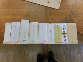 頂いたお札、全部で9つの神社がある。大きさもそれぞれだが、毎年同じ大きさだと思われる。