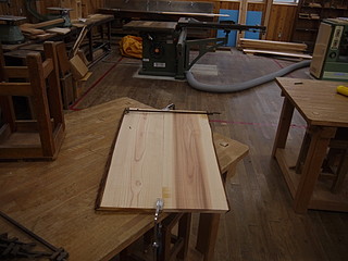 かなり反りがあるのと、今の学校には手押し鉋盤が使えないので基準面を作ることができない。