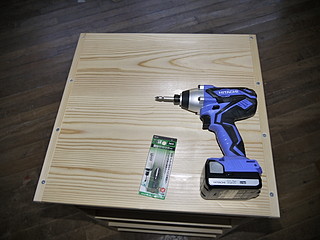 天板はコーススレッドを打ちたくなかったけれど、反りを押さえる必要があったので面取りビットで座ぐりをしてから押し込んだ。