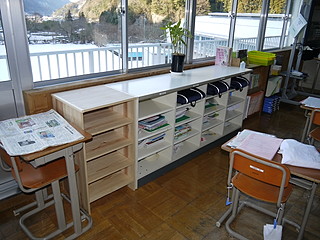 学級に設置したところ。他のものはフラッシュパネルでできているから白いけれど、今回作ったのは学有林の材を使ったところに良さがあることでしょう。