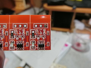 思っていたよりも小さい感じ。Vカットが入った基板で5個ずつつながっていた。