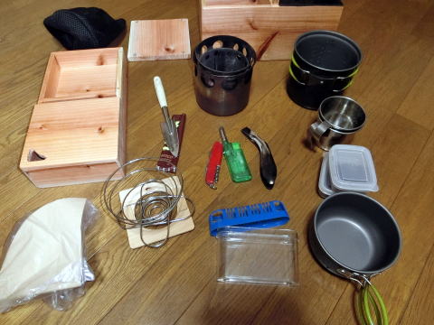 収納している中身。このほかに水や燃料の木っ端などは別になってしまうが、車のトランクに入れて持ち運んでいる。