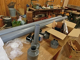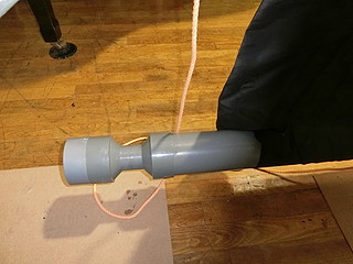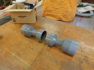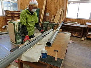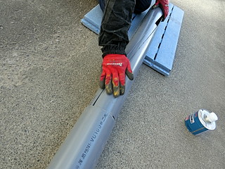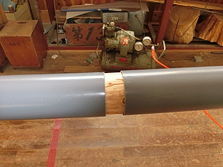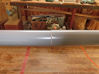 下で巻き付ける「芯」は100mmの塩ビ管にした。4mものなので、真ん中でつなぐ。
