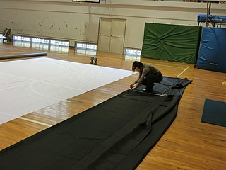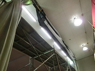 エプソンの7000ルーメンプロジェクターを借りてきてテストする。実際にはこの位置の真上のバスケットゴール構造材から投影する予定。