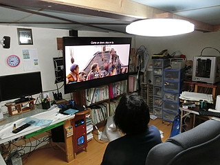 左側のモニターと机が普段の仕事用。映画館商用には右側に切り替えて使います。なんせ消費電力150wなので、映画のときのみ電源を入れます。