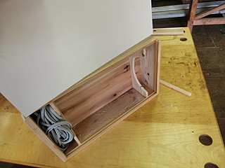残っていたスギ板で箱を作る。今回は電源ケーブルとリモコンも入れることができるように内部を3つのブロックに分けた。