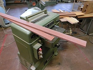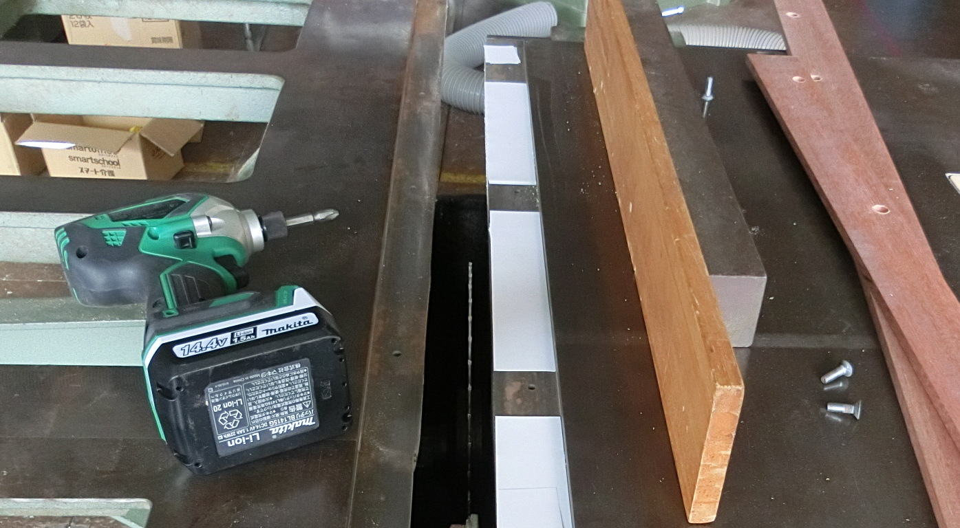 定盤端の木材、長年の使用で傷んでいるのと、テーブルの縁との段差が気になっていた。 校舎改築に来ていただいている業者さんから、床用の木材を頂くことができたので加工する。
