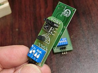 左側がプロトタイプとしてユニバーサル基板につくったもの、DIPスイッチでセンサを選べるようにしてみた。右側の写真は、基板におこした最終版。