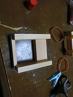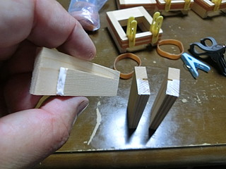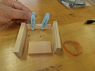 全員一斉に作ることができるように、輪ゴムと洗濯ばさみで固定してボンドが固まるのを待つ。