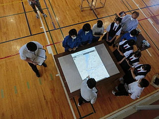 プロジェクタは普通のものなので、体育館のギャラリーからでないと大きさとピントのバランスが取れなかった。