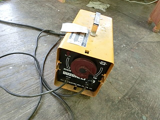 横切り盤から200Vを延長して溶接機を稼働させる。もらってきた溶接棒が1.6mmだったので一番弱にして使った。