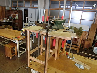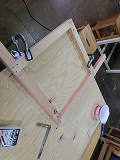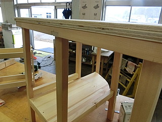 職員室の机配置を変更して以来、以前の設計で取り付けたコンセントボックスが邪魔でつい毛手しまう状態だった。残り材でテーブルを作ることにした。