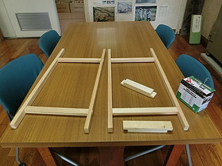 垂木を半分に縦割りして、通しホゾの枠と、短い方向は片側をかいた材を加工。後は自校で組み立てた。