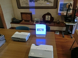 2つ余っていたので、壁方向に加えて天井から机に投影する方向にも取り付けてみた。