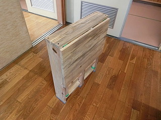 天板を上げて、足を90度回転させるとテーブルとして安定する。外での作業時など持っていって使えるかなと。