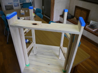 全開製作したバタフライテーブルと同じ構造で、上を伸ばして箱を付け、本部旗を立てるガイドを取り付けた。