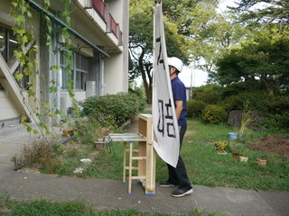 机を広げて旗を立てたところ。引き渡し用の名簿チェックなど、机を使うことになる。