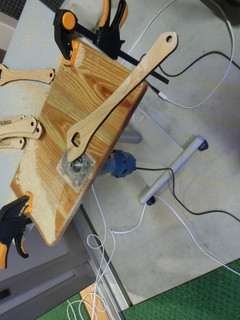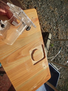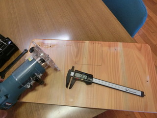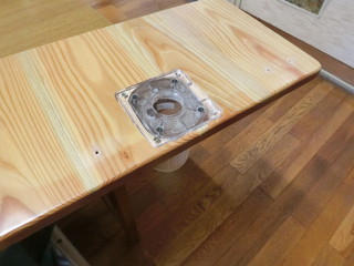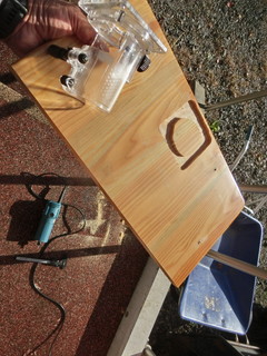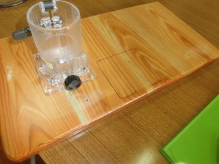 木べらを製作する過程で、面取りはトリマですることにして中学校から借用してきた。 300ほど作ることもあって、テーブルに取り付けて加工することにした。 使い古した児童の机天板を使って、トリマの台座が埋まるように形をとる。 トリマを使って、台座が面一に埋まる深さに溝を掘り、モータ等が抜けるように穴を開ける。 その板をテーブルにバイスで固定して作業をした。量産には必要な治具でした。