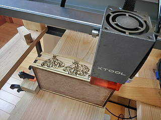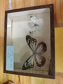 小学生がつくる蝶の標本箱に図工で描いた絵を彫刻した。 この蝶の標本箱はサンプル。これを参考にレーザ加工機で標本箱も部品作りをした。 子どもが描いた絵をスキャンした後、輪郭線を読み出してレーザで加工した。