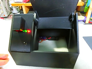 ゴミ箱自体は3Dプリンタで造形して、蓋部分をセンサーによって手を検出して自動開閉するようにした。サーボモータの附属ホーンで直接駆動する形にした。