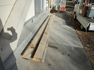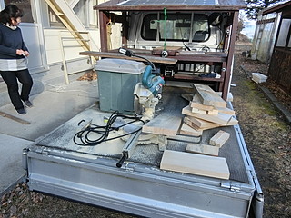 製材して乾燥機にかけてもらった材が届いたので、机の長さに切断して、よいところを取り出す。